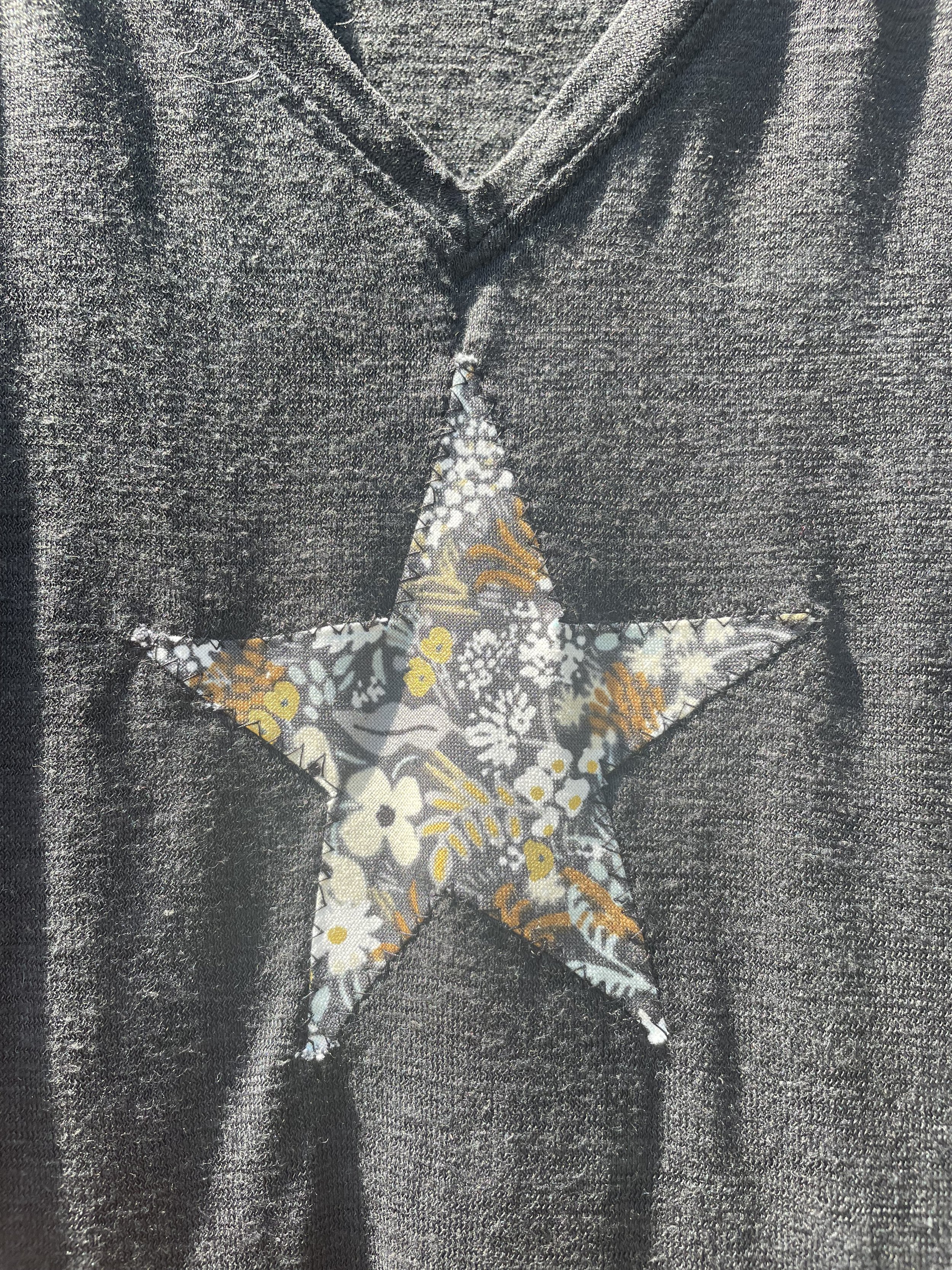 Black T-shirt dress with star patchwork. 55% hemp 45% cotton.